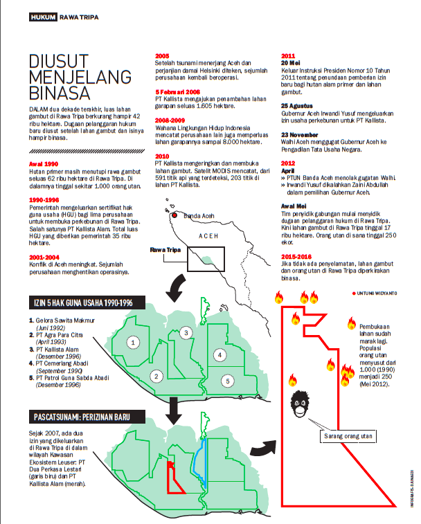 Hingga awal 1990, orang utan di hutan gambut seluas 62 ribu hektare di Rawa Tripa berjumlah 1.000 ekor. Bencana datang ketika pemerintah Orde Baru memberikan hak guna usaha (HGU) kepada sejumlah perusahaan swasta pada 1991. Perusahaan-perusahaan itu menggasak hutan gambut, lalu menyulapnya menjadi kebun kelapa sawit.
