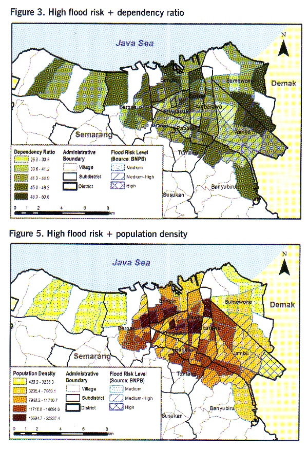 Penelitian oleh UNFPA tersebut menganalisis Peta Ancaman Bahaya yang dikeluarkan oleh BNPB dan Data Potensi Desa yang dikeluakan oleh BPS. Berikut analisis mereka mengenai Semarang yang dinilai rentan bencana. Pertama, Semarang memiliki pantai dengan elevasi rendah, sebagaian besar Kota Semarang berada pada Zona Pantai Dataran Rendah atau LECZ, yaitu daerah dengan ketinggian kurang dari 10 meter di atas permukaan laut. Kedua, Rasio ketergantungan penduduk yang tinggi terjadi di sebagian wilayah yang memiliki risiko banjir tertinggi. Rasio ketergantungan penduduk menggambarkan kelompok penduduk usia nonproduktif, yaitu di bawah 15 tahun dan di atas 64 tahun. Hubungan ini sangat penting untuk memahami bahwa kelompok penduduk usia muda dan lanjut usia sangat rentan terkena dampak bencana banjir dan genangan air. Tantangan yang dihadapi adalah evakuasi untuk kelompok usia tersebut jika bencana terjadi dan kemungkinan terkena penyakit banjir dan genangan air.