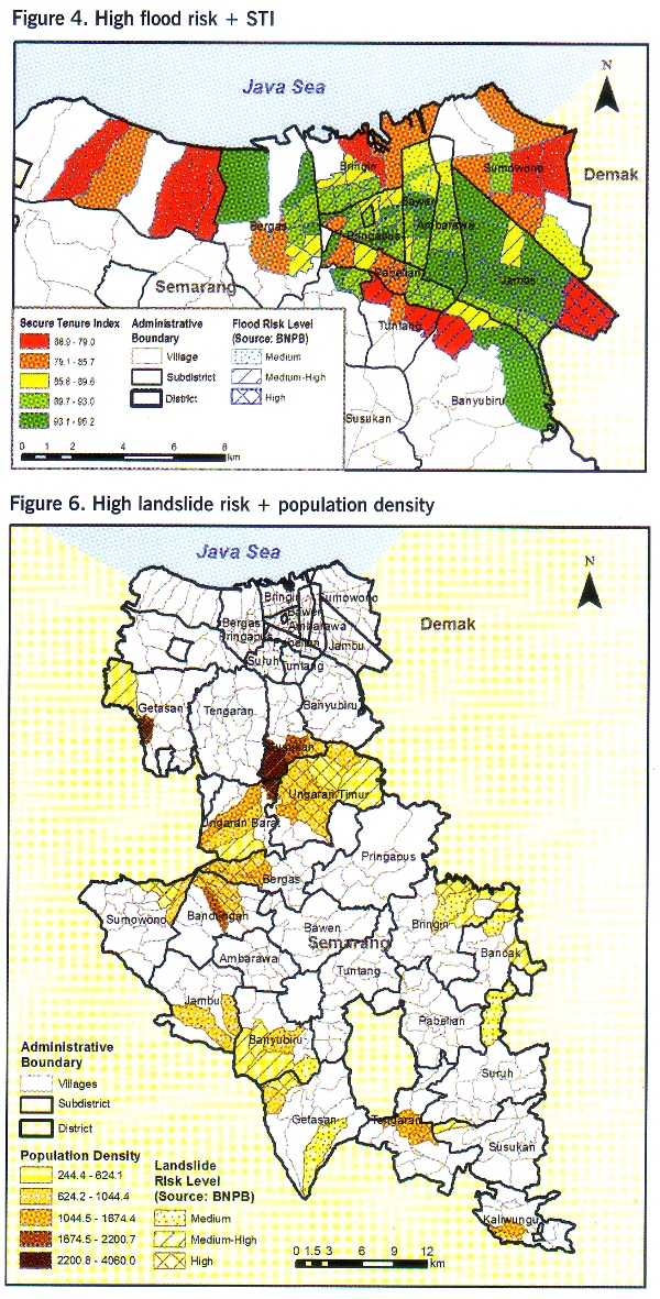 Ketiga, risiko banjir tertinggi ada pada kawasan dengan kepadatan penduduk tertinggi pula. Sekitar 840.000 penduduk Kota Semarang tinggal di dataran rendah dengan kepadatan penduduk rata-rata mencapai 10.201 jiwa/km2. Sebagian besar desa dengan kepadatan penduduk tinggi terletak di wilayah pantai dan pusat kota Semarang, seperti Bangunharjo, Jagalan, Sarirejo, dan Rejosari. Hal ini menyebabkan perlunya persiapan strategi evakuasi dan penyediaan tempat penampungan sementara.
