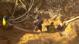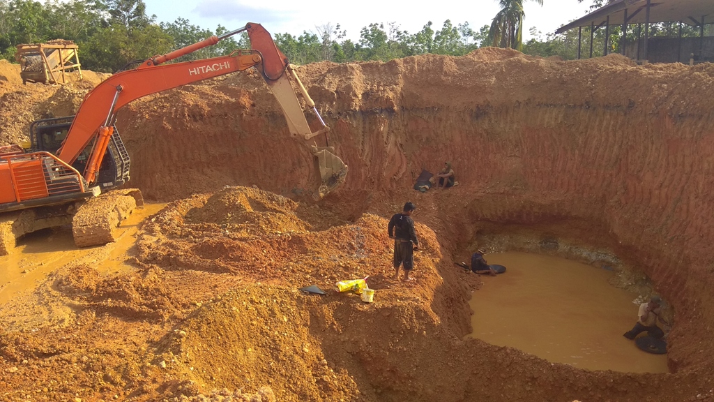 Sekitar 200 meter di belakang rumah Sukar, di Mengkadai, suara lima mesin dompeng keong empat seperti beradu keras, terdengar riuh di antara semak-semak di lahan tidur. Puluhan penambang emas berada dalam lubang besar sibuk membuang batu-batu sekepalan tangan, yang lain meruntuhkan tebing dengan menyemprotkan air yang keluar dari ujung selang berukuran satu setengah inch.
