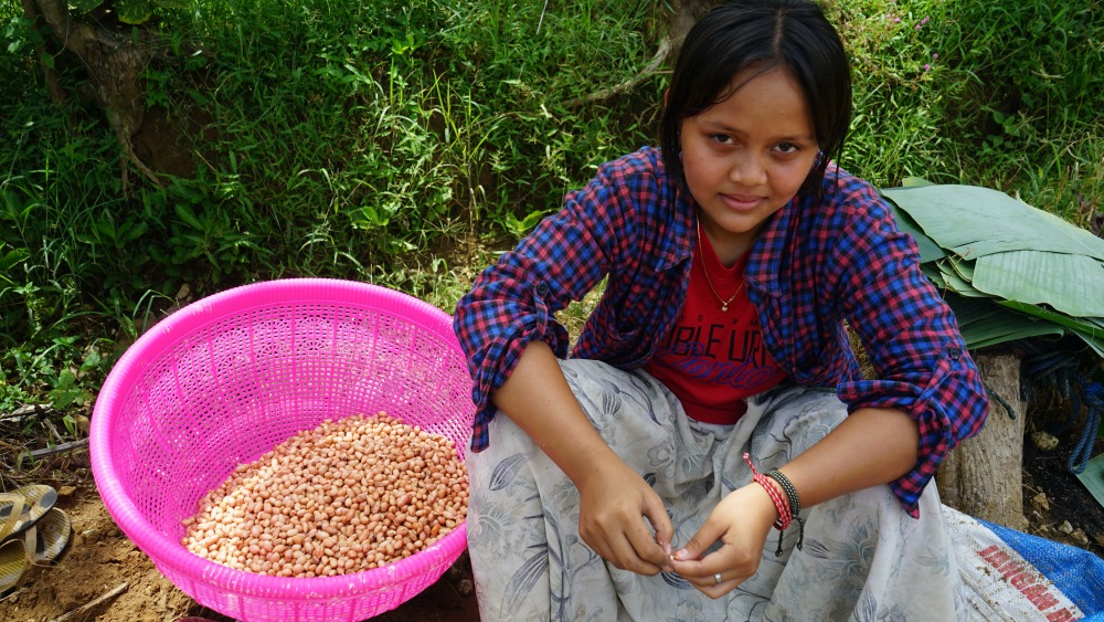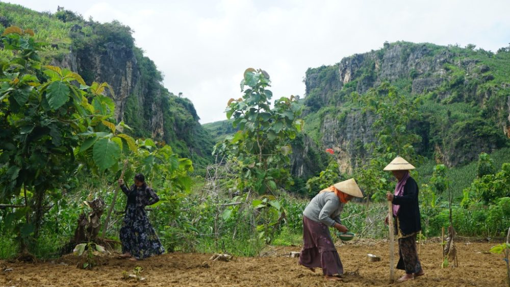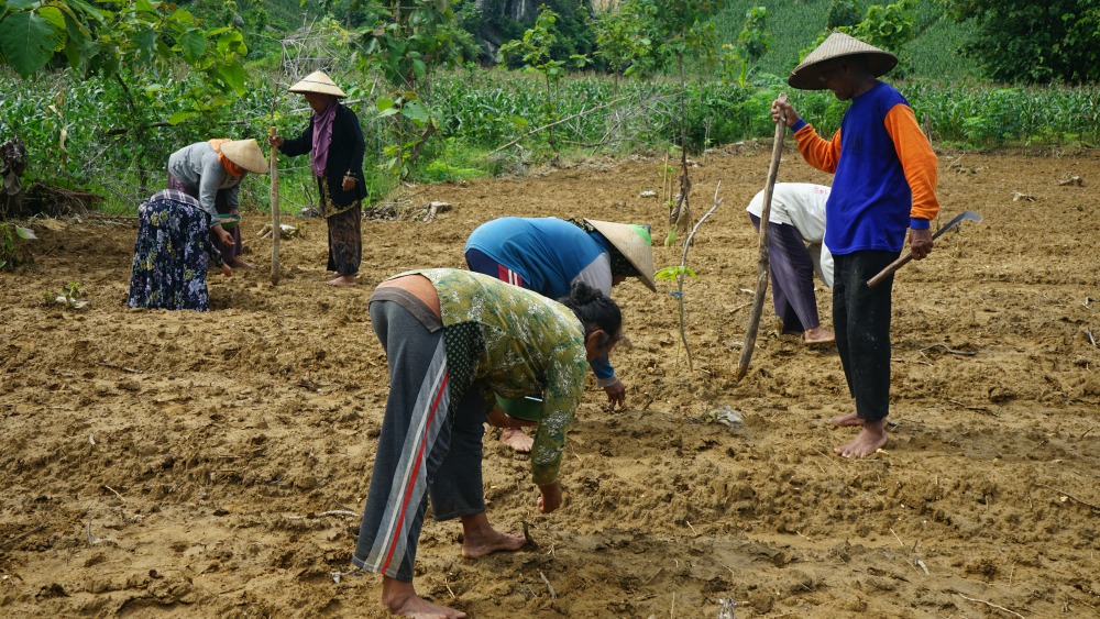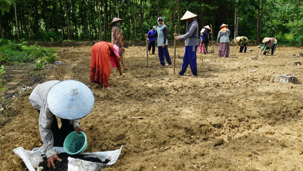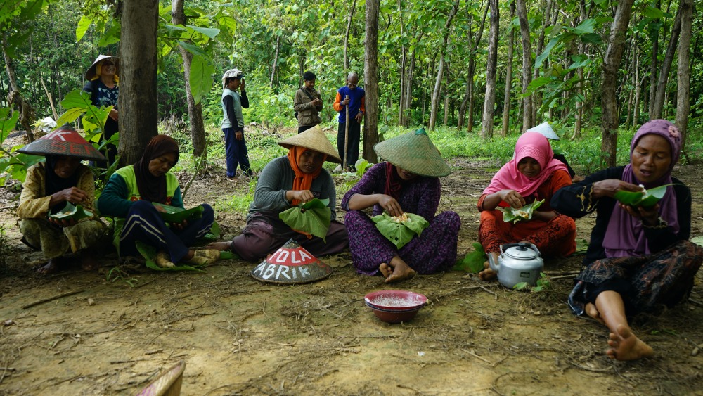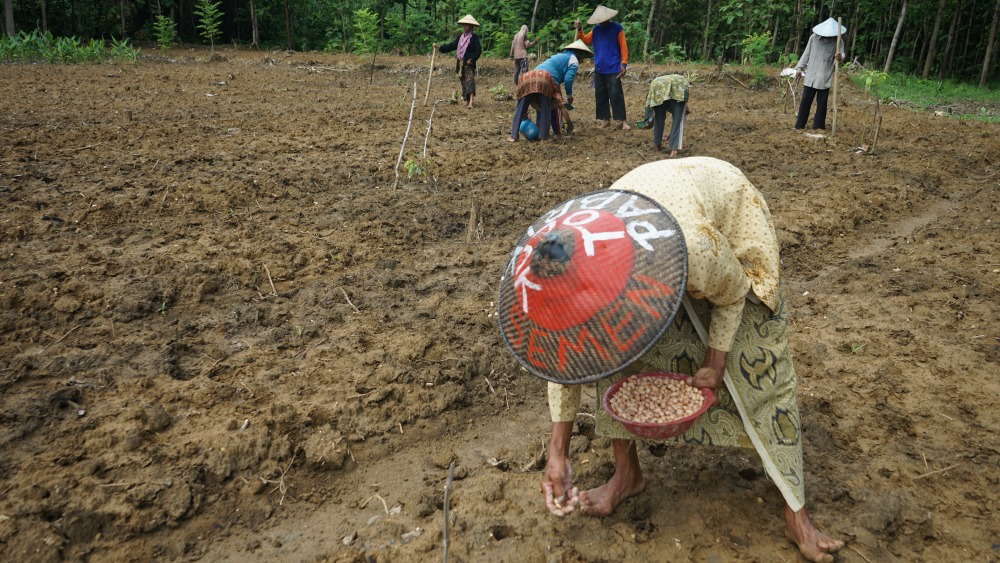 Musim tanam adalah berkah bagi para petani di Pegunungan Kendeng. Gun Retno mengajak para petani Kendeng gotong-royong menanam kacang di lahan dekat hutan jati yang berdinding tebing karst. “Kacang ini tiga bulan sudah panen. Saya juga menanam buah-buahan; pisang, pepaya, mangga dan semangka,“ ujarnya.