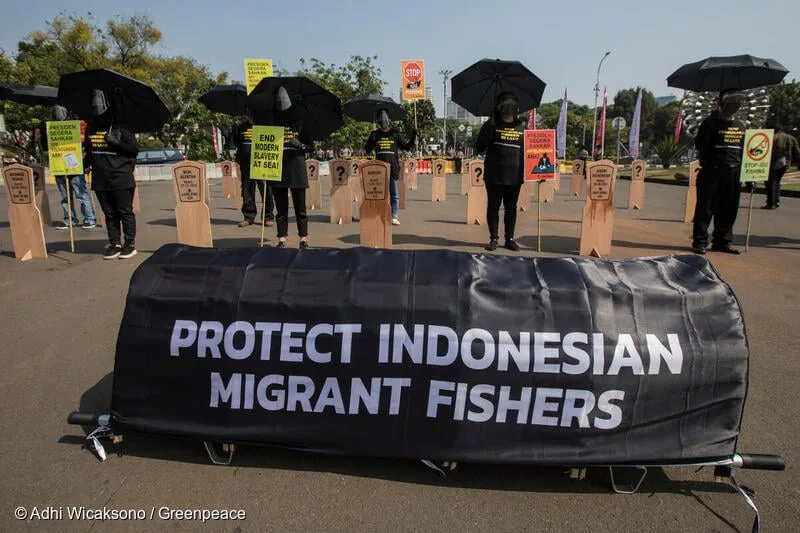Aksi damai pelaut migran Indonesia di Istana Kepresidenan. SBMI-Greenpeace dorong perlindungan pelaut migran Indonesia sesuai UUD 1945.